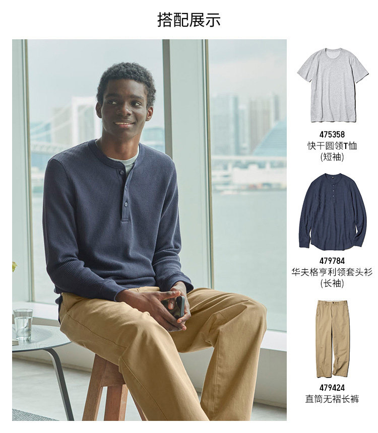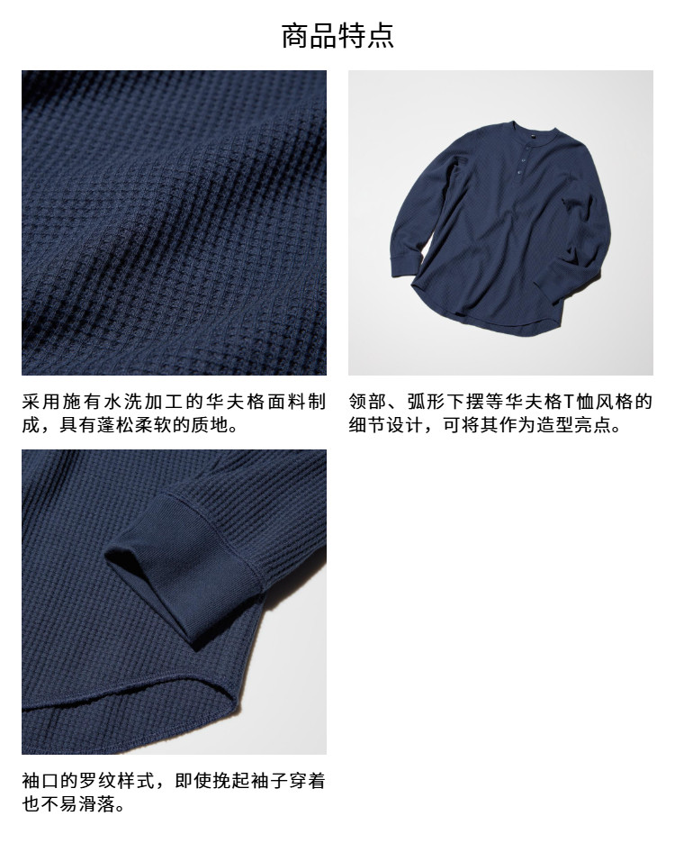 Uniqlo男装女装情侣华夫格亨利领套头衫长袖T恤479784 482766