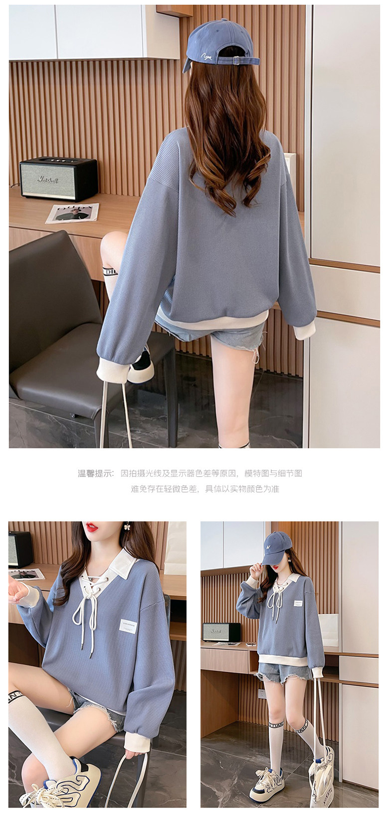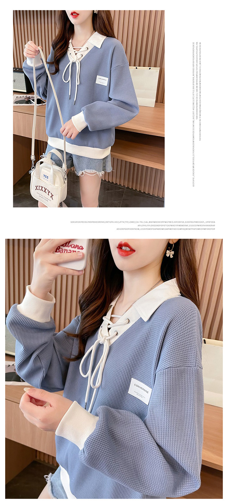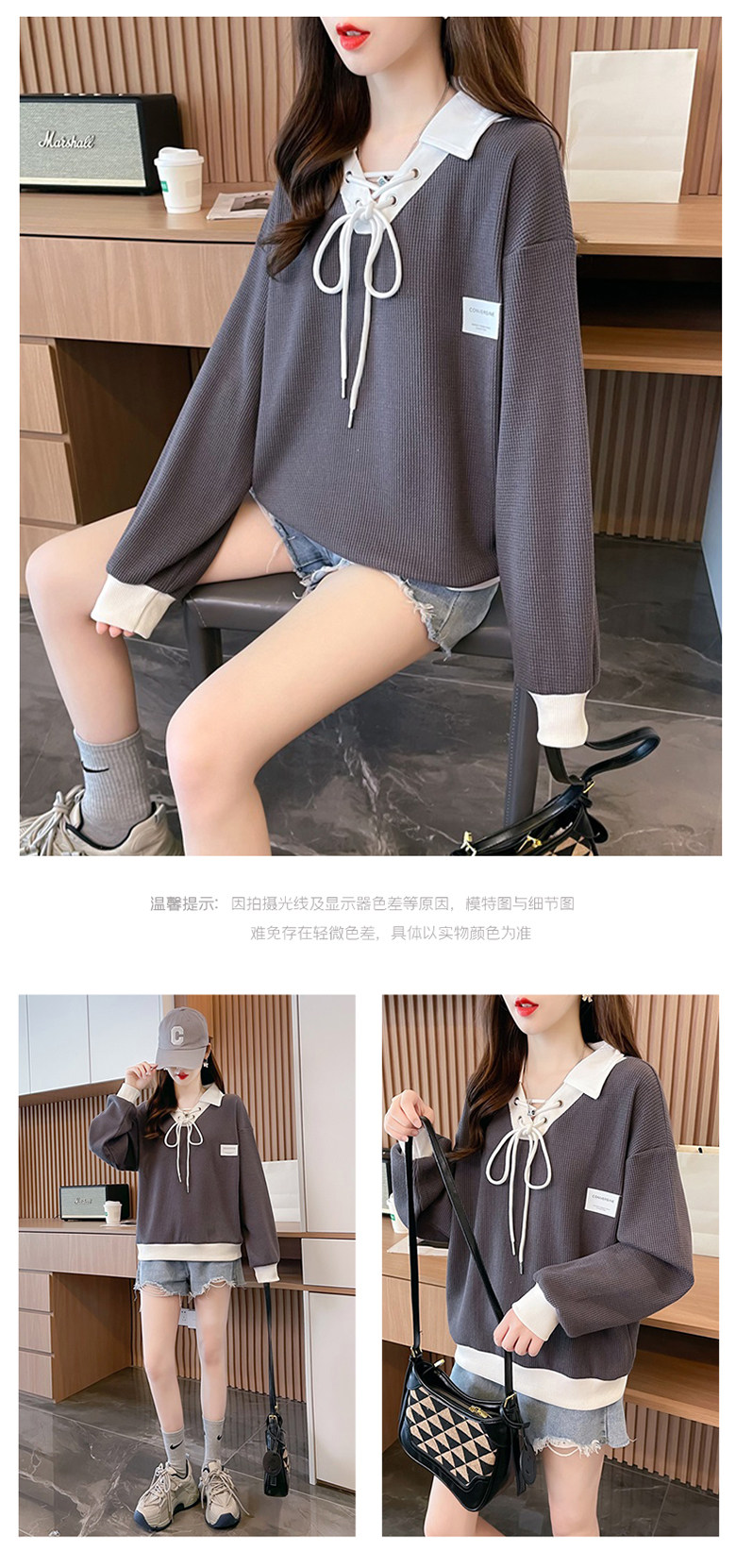 polo领华夫格卫衣女秋冬加绒2025新款宽松韩版设计感撞色翻领上衣