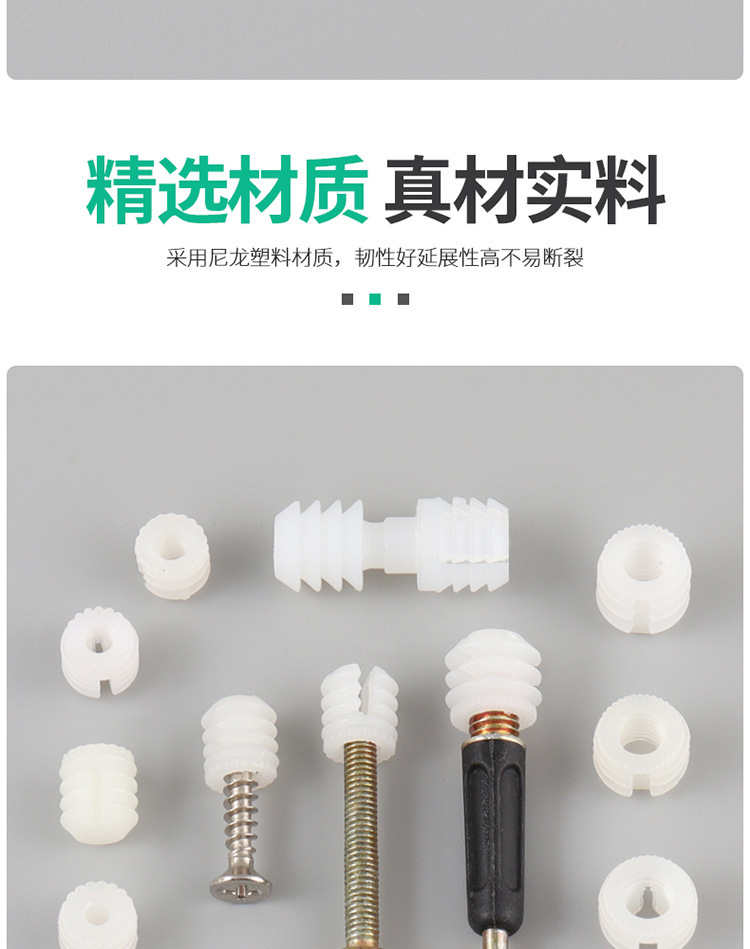 3-in-1 내장 부품, 확장 플라스틱 너트, 힌지, 셀프 태핑 나사, 고무 입자, 나일론 핸들, 개방형 내장 부품