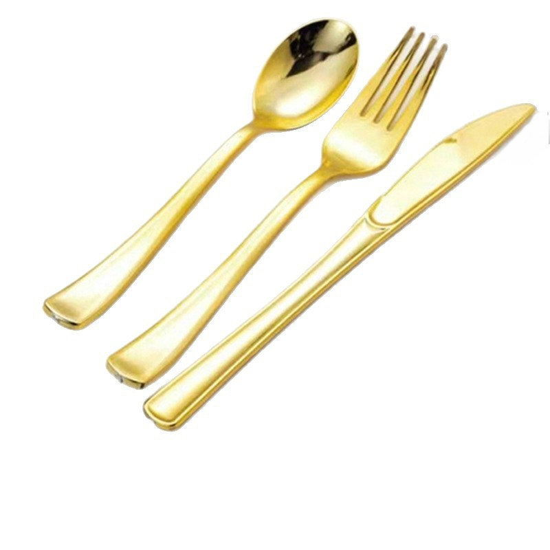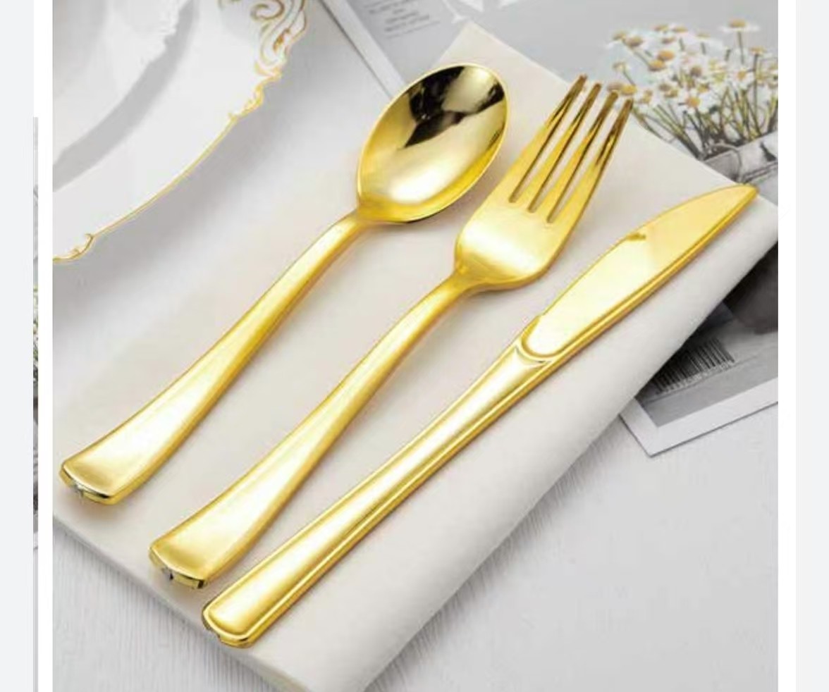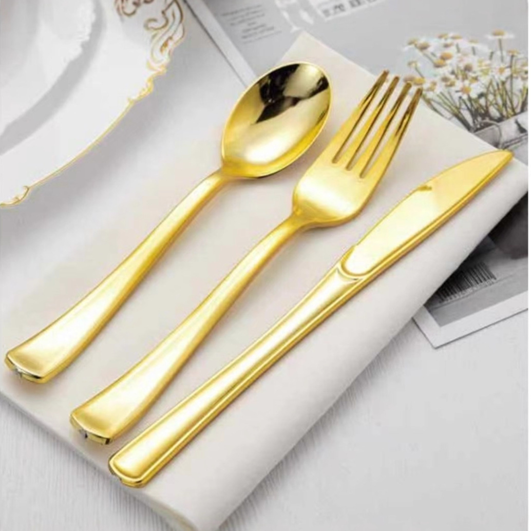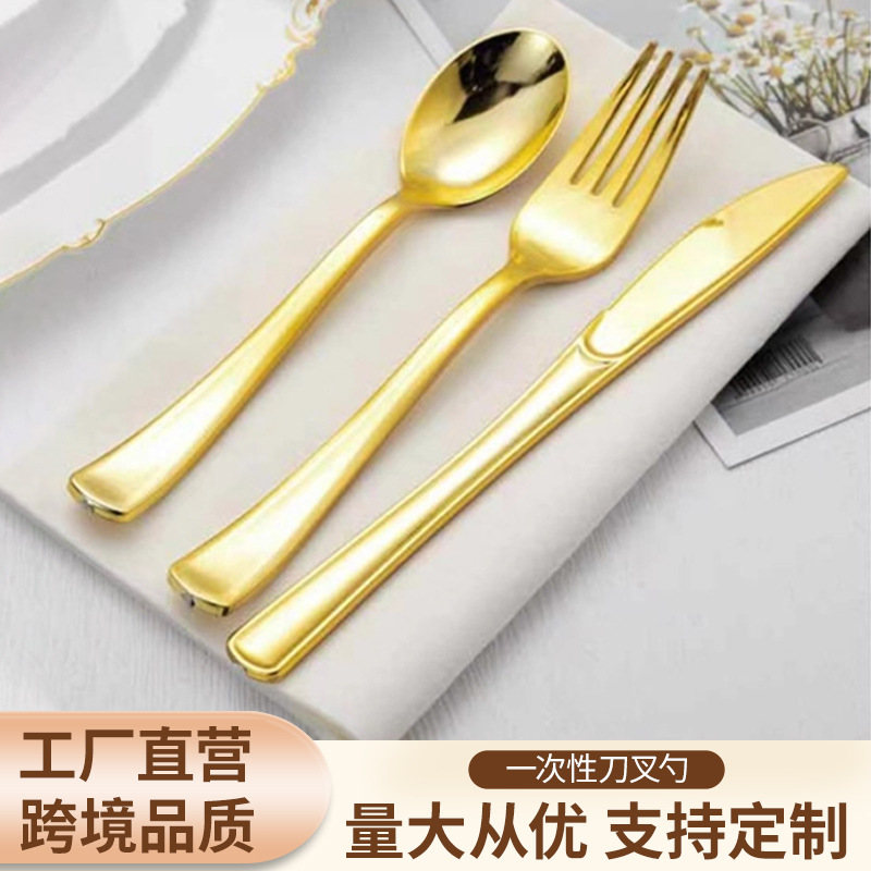 크로스보더 PS 플라스틱 나이프, 포크, 스테이크, 양식 세트, UV 도금 골드 일회용 나이프, 포크, 스푼, 생일, 결혼식 식기류